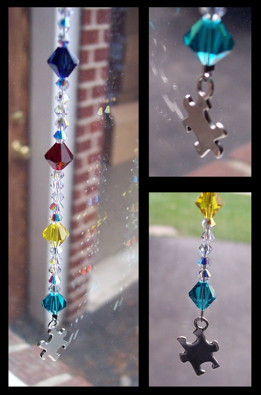 Breathtaking arrays of color sparkle with these beautiful sun catchers.  Hand-strung,  swavorski crystals intertwined with autism awareness colored beads and sterling silver puzzle piece.
